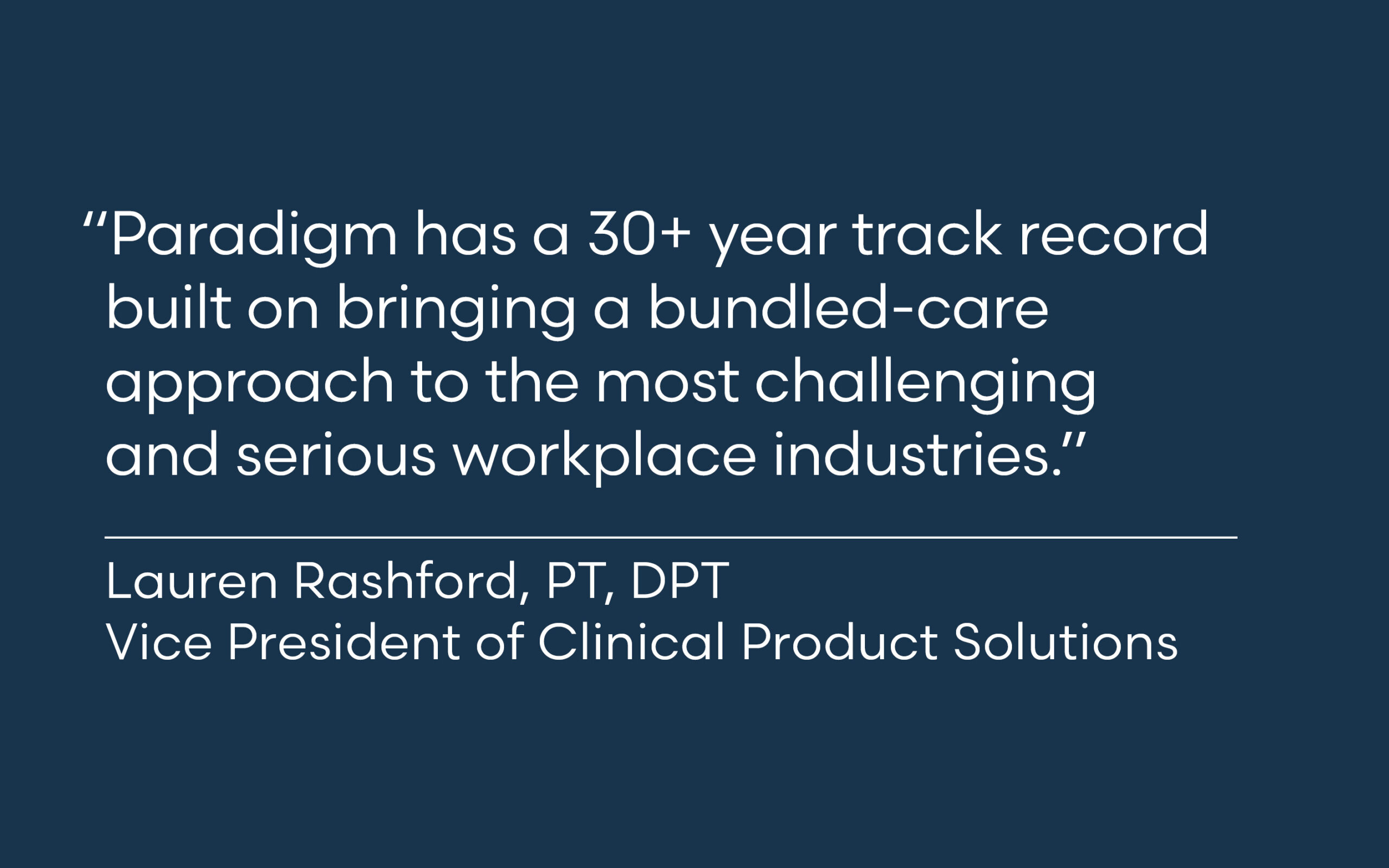 “Fragmented care and misaligned incentives in workplace injury care have driven unacceptable variation in cost and outcomes,” says Lauren Rashford, PT, DPT, Vice President of Clinical Product Solutions at Paradigm. “Thoughtfully designed bundles that center the entire system on recovery gives the industry a path toward predictable, value-based results.”